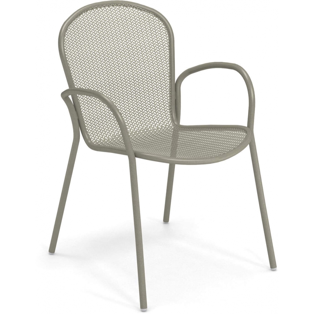 Die Ronda XS-Kollektion besteht aus einem Stuhl, einem Sessel und einem Hocker. Die Struktur besteht aus Eisenrohr und die Rückenlehnenfläche aus vorverzinktem Streckmetall. Nylon Einlegesohlen. Das Blech wird weich gemacht durch die Form, die den Kurven des Körpers folgt, und durch das Design, das an einen Stoff erinnert. Der Sessel nutzt moderne Technologien wie die doppelte Krümmung, die unter Beibehaltung der Einfachheit des einzelnen Rohrs für Beine und Armlehnen den Komfort mit der Armlehne, die sich bis zum Körper erstreckt, um den Ellbogen zu stützen, erhöht. Die Form der Armlehne erinnert an die Kurven der Rückenlehne und die Neigung zum Rücken folgt der Ergonomie des Benutzers. Dank des Spiels paralleler Rohre und Krümmungen zwischen Schale und Armlehne entsteht der einhüllende Charakter, der den Sessel auszeichnet. Vorbehandlung, Kataphorese, Veredelung mit duroplastischen Pulvern.