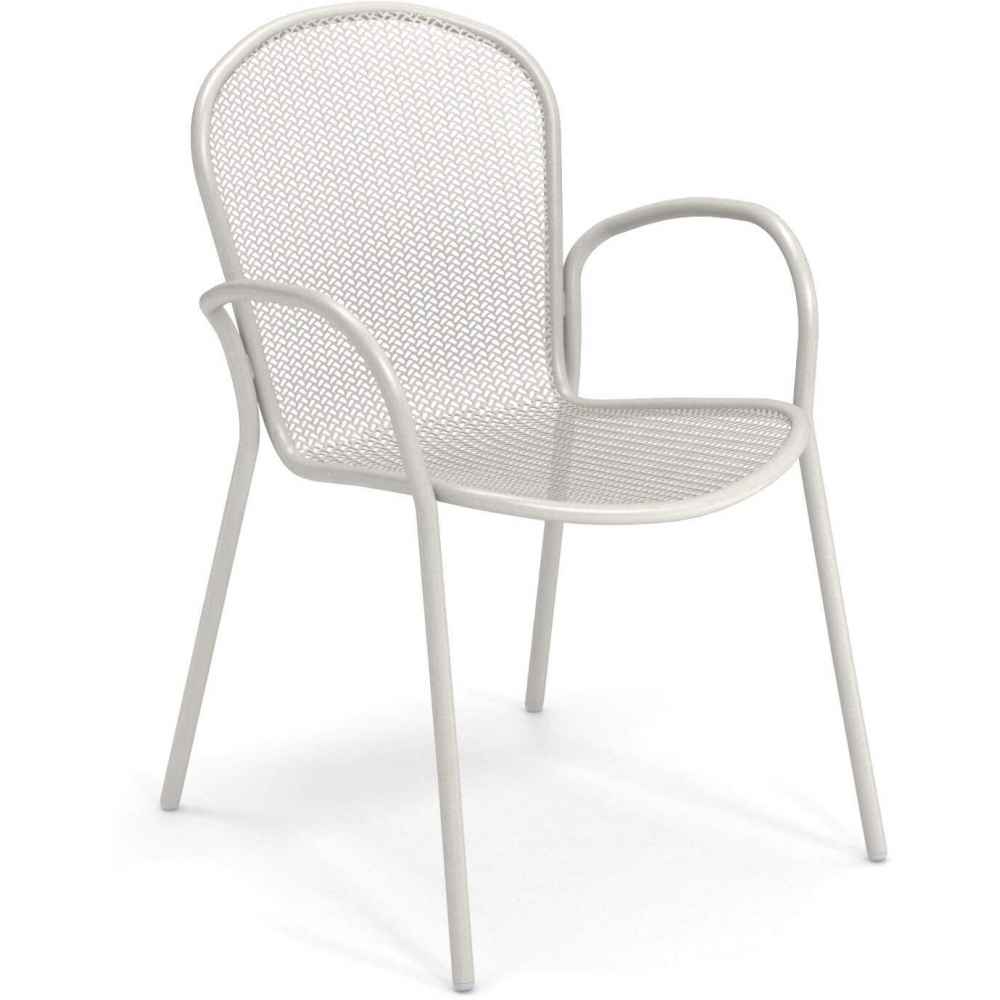 Die Ronda XS-Kollektion besteht aus einem Stuhl, einem Sessel und einem Hocker. Die Struktur besteht aus Eisenrohr und die Rückenlehnenfläche aus vorverzinktem Streckmetall. Nylon Einlegesohlen. Das Blech wird weich gemacht durch die Form, die den Kurven des Körpers folgt, und durch das Design, das an einen Stoff erinnert. Der Sessel nutzt moderne Technologien wie die doppelte Krümmung, die unter Beibehaltung der Einfachheit des einzelnen Rohrs für Beine und Armlehnen den Komfort mit der Armlehne, die sich bis zum Körper erstreckt, um den Ellbogen zu stützen, erhöht. Die Form der Armlehne erinnert an die Kurven der Rückenlehne und die Neigung zum Rücken folgt der Ergonomie des Benutzers. Dank des Spiels paralleler Rohre und Krümmungen zwischen Schale und Armlehne entsteht der einhüllende Charakter, der den Sessel auszeichnet. Vorbehandlung, Kataphorese, Veredelung mit duroplastischen Pulvern.