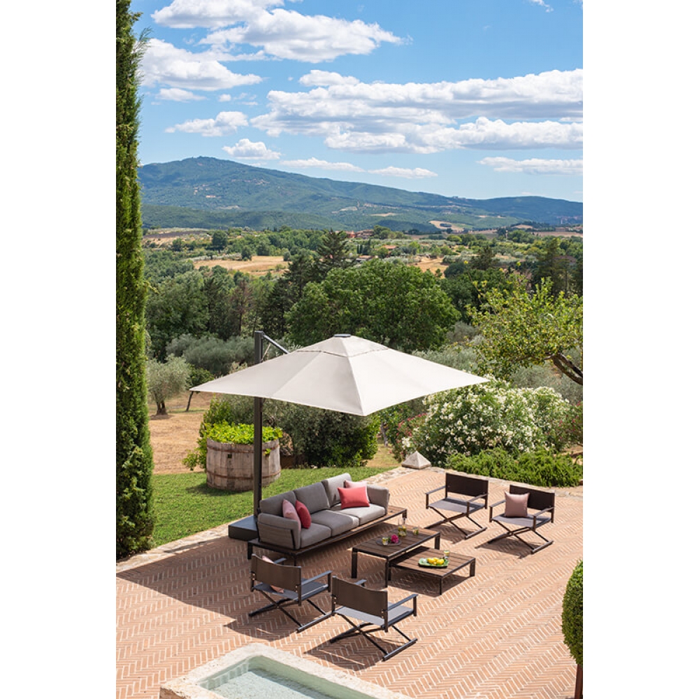 Der Sonnenschirm Piazza Trevi, by EMU D&S Lab, ist ideal, um schattige und sonnengeschützte Bereiche sowohl für die Contract- als auch Wohnanwendung zu schaffen. Ein nicht wegzudenkendes Zubehör auch für Abende draußen, dank dem innovativen, ferngesteuerten Beleuchtungssystem, dessen einzigartiges Strahlendesign von in den Paragonstangen eingebauten LED-Leuchten geschaffen wird. Der praktische Öffnungs- und Schließmechanismus erfordert kein Umstellen der Möbel und Geräte, die unter dem Sonnenschirm stehen. Weitere einbaubare Zubehörelemente wie Ablaufrinnen, Bodenverankerungen und Wandbefestigungen vervollständigen seine ganze Funktionalität.