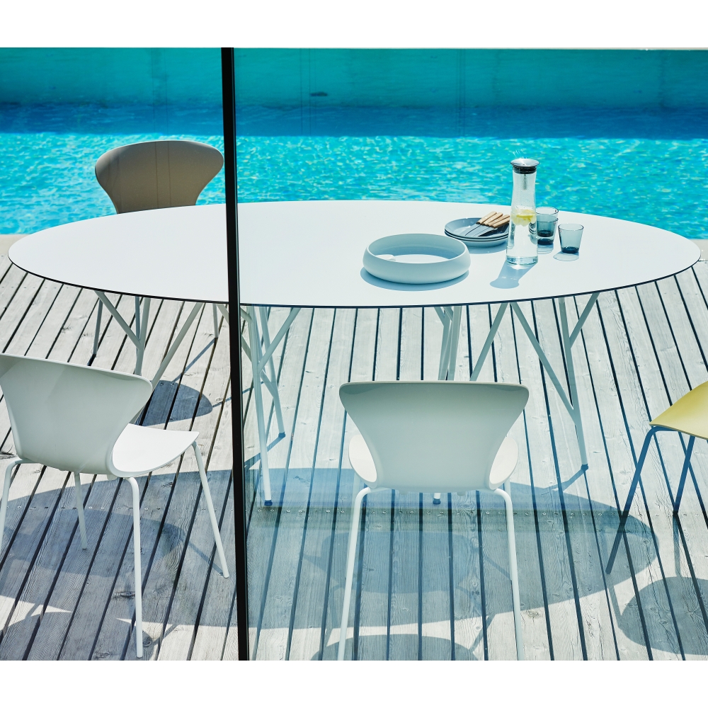 Gestell: Stahlrohr pulverbeschichtet; Tischplatte: HPL-Schichtstoff