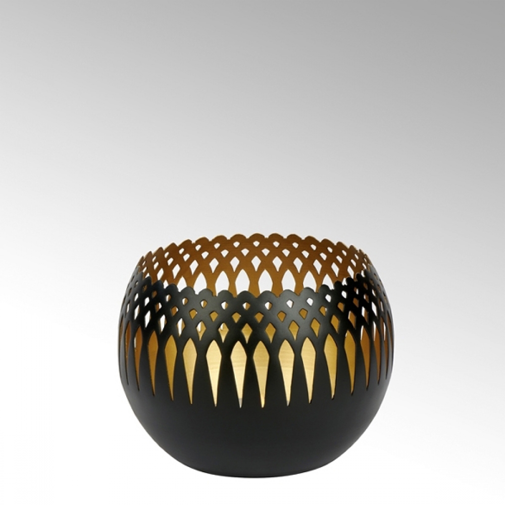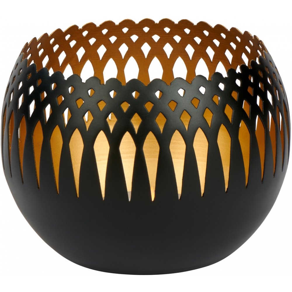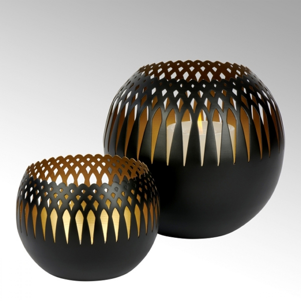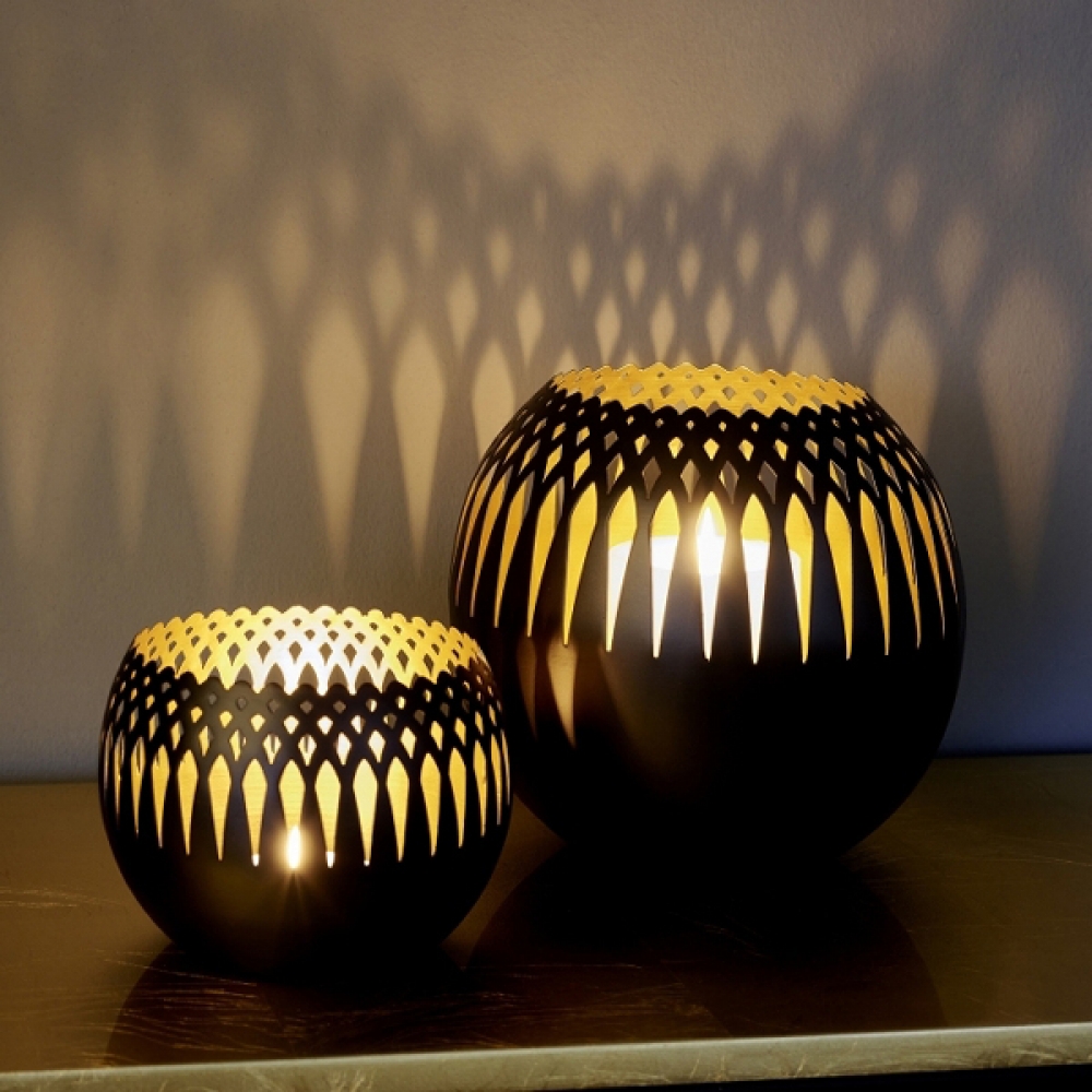 Kleine, spannend gestaltete Windlichter können zu einem nicht zu missenden alltäglichen Begleiter Ihrer Tischdekoration werden. Oman ist wie der Name schon sagt inspiriert von der traditionellen Kunst des mittleren Ostens. Das graphische Muster wird im Ätzverfahren aus dem Metall ausgeätzt. Innen wird das Windlicht mit einem Goldton belegt um das Licht besonders weich und warm erscheinen zu lassen. Wachsreste können vorsichtig mit warmen Wasser gelöst werden. Verwenden Sie keine scharfen Gegenstände die die Oberfläche zerkratzen können.