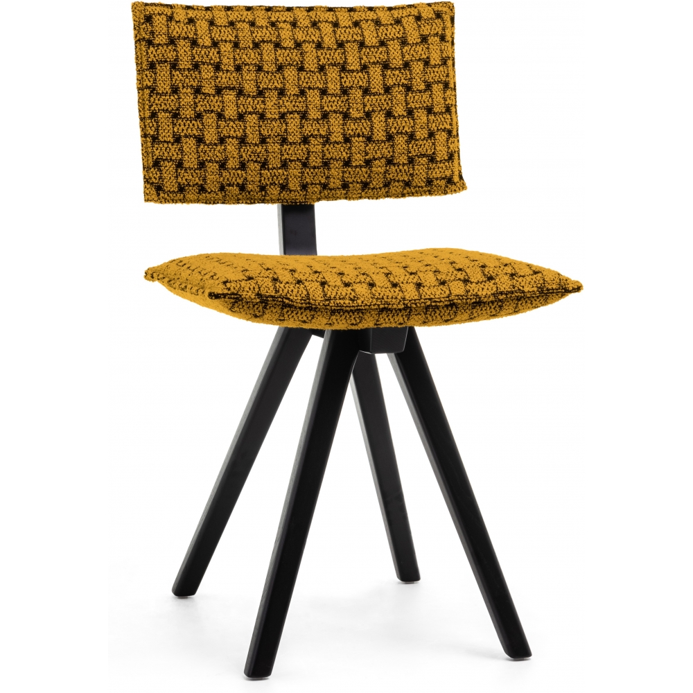 Material Gestell aus massiver Esche, natur oder lackiert. Sitz und Rücken gepolstert und mit Stoff bezogen.