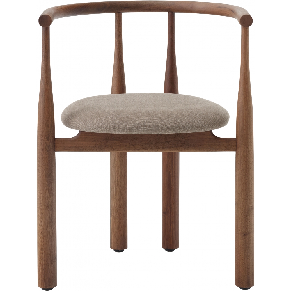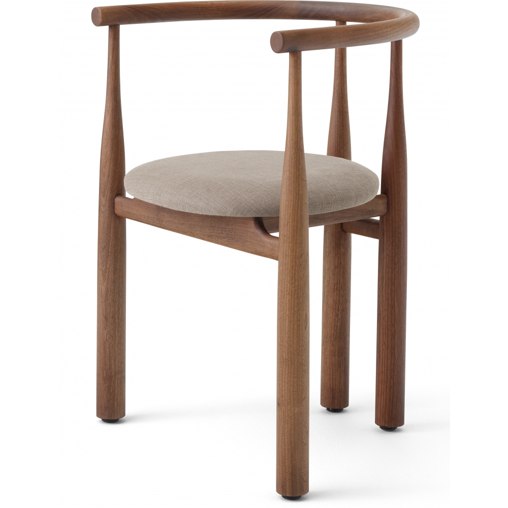 Ein Rückgriff auf die Moderne der Jahrhundertmitte? Nicht ganz. Die extremen Proportionen sorgen bei dieser Aktualisierung eines alten Klassikers für eine elegante und überraschende Form. Der sanfte, aber entscheidende Wechsel zwischen schlank und massiv, der die geschwungenen Beine des Stuhls hervorbringt, wird wie ein lebendiger Tanz mit dem Material gespielt. Die Balance des Gewichts zum Boden hin verleiht dem Stuhl eine starke und monumentale Ausstrahlung. In der Mitte der skulpturalen Struktur befindet sich eine gepolsterte Sitzfläche, die durch die Kombination von Holz und Textil verschiedene Ausdrucksmöglichkeiten bietet. Mit seiner kühnen Geometrie zeigt der Bukowski-Stuhl eine markante Silhouette, die sofort erkennbar, undefinierbar vertraut und völlig eigenständig ist.