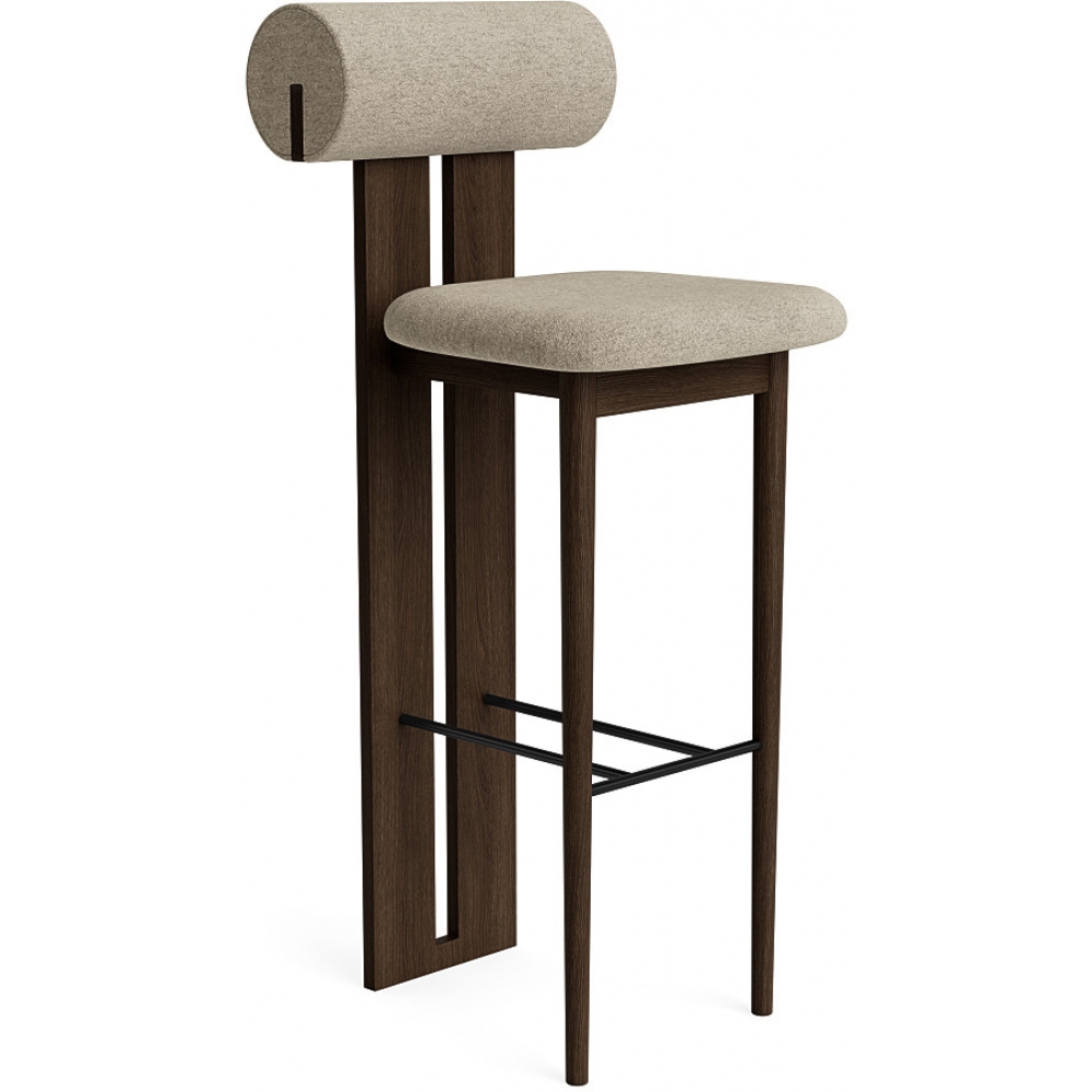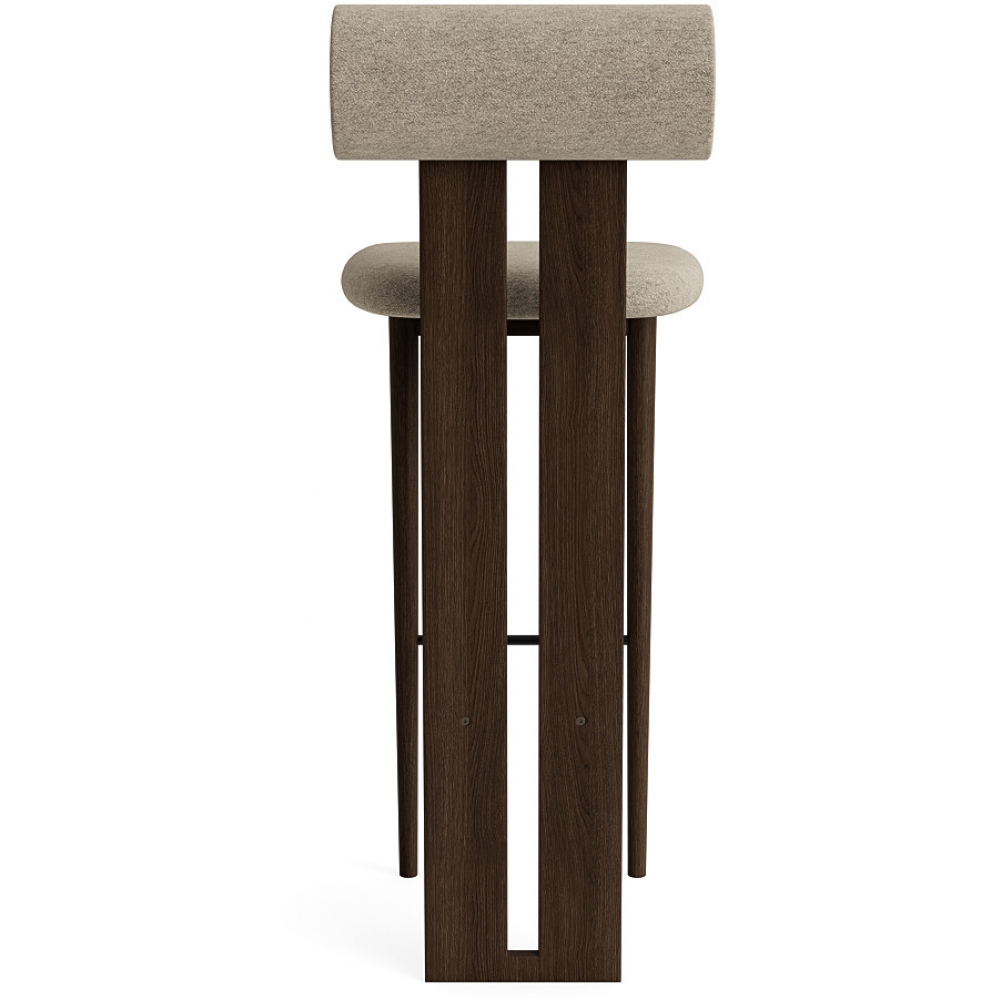 Der Hippo Barhocker ruht auf zwei stabilen Holzbeinen, die Sitz und Rückenlehne nahtlos miteinander verbinden, und ist eine Barversion des kultigen Hippo Chair | Full Upholstery. Das markante Holzprofil wirkt wie ein fast architektonisches Element, das in starkem Kontrast zu der abgerundeten, weichen Rückenlehne und Sitzfläche steht und Hippo Bar von hinten genauso schön macht wie von vorne.