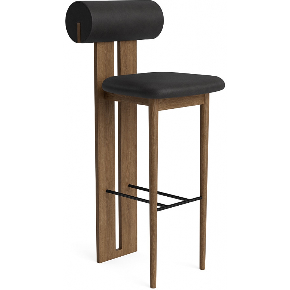 Der Hippo Barhocker ruht auf zwei stabilen Holzbeinen, die Sitz und Rückenlehne nahtlos miteinander verbinden, und ist eine Barversion des kultigen Hippo Chair | Full Upholstery. Das markante Holzprofil wirkt wie ein fast architektonisches Element, das in starkem Kontrast zu der abgerundeten, weichen Rückenlehne und Sitzfläche steht und Hippo Bar von hinten genauso schön macht wie von vorne.