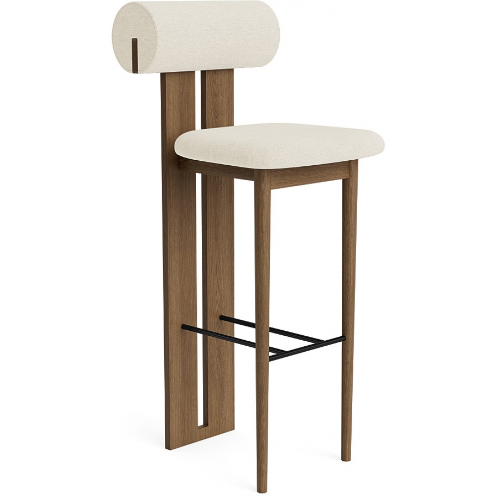 Der Hippo Barhocker ruht auf zwei stabilen Holzbeinen, die Sitz und Rückenlehne nahtlos miteinander verbinden, und ist eine Barversion des kultigen Hippo Chair | Full Upholstery. Das markante Holzprofil wirkt wie ein fast architektonisches Element, das in starkem Kontrast zu der abgerundeten, weichen Rückenlehne und Sitzfläche steht und Hippo Bar von hinten genauso schön macht wie von vorne.