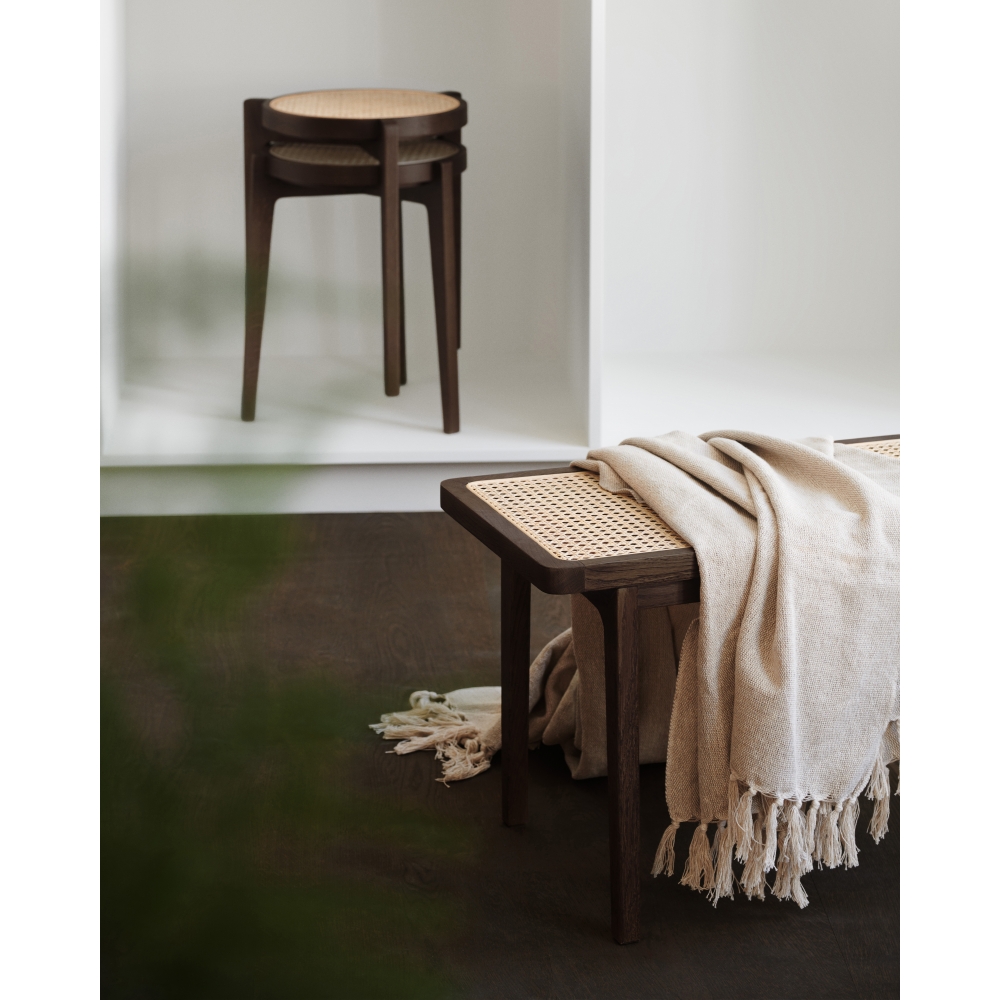 Der Beistelltisch Le Roi ist aus massiver Eiche mit eingelegtem französischem Rattan gefertigt. Er kann sowohl als Sitz als auch als Tisch verwendet werden. Die Serie Le Roi ist nach dem französischen Wort für „König“ benannt.