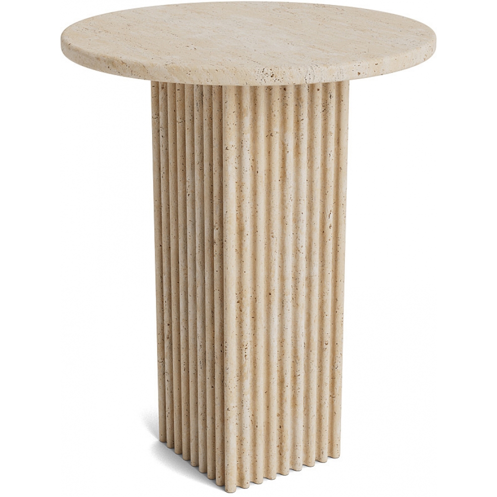 Soho ist aus Travertin mit einer natürlichen Oberfläche mit kleinen Löchern und Unregelmäßigkeiten. Der aus Travertinplatten gefertigte Tisch ist dennoch leicht und einfach zu bewegen. Die geriffelte Oberfläche des Natursteins verleiht ihm Taktilität, während die Schatten im Laufe des Tages die Tiefe und den Charakter der Steinoberfläche widerspiegeln.
